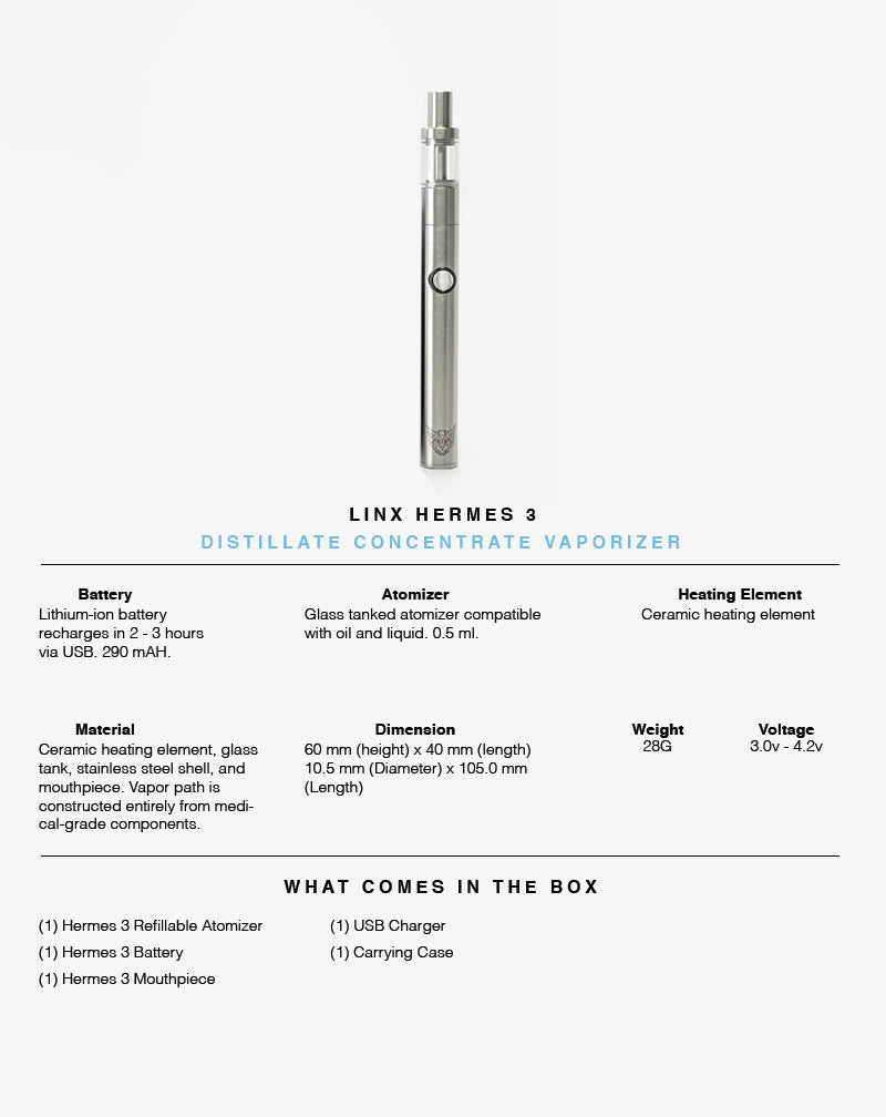 It doesn’t matter what viscosity your oils are, our Hermes 3 distillate vape can handle them all. When you’re making a vape comparison for distillates it’s easy to see why the Hermes 3 outshines all the different vapes. Its refillable cart allows you to keep your session going all week long while the ceramic heating element funnels all your oil to the source so you don’t waste any distillate in the process. On top of that, the vapor path is consciously crafted from medical-grade materials and is lab tested 100% free from all toxins.
